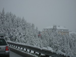 Next morning we set off over the Simplon Pass to get into Italy and encountered our next weather condition – it was snowing!