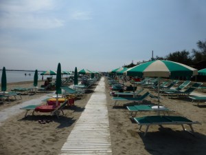 We’re heading South now and have stopped for a couple of days relaxation (not that everyday isn’t relaxing!) by the sea near Comacchio, where there are a number of Lido resorts and a few big campsites. Very busy over the weekend but last night (Sunday) at about 6pm 80% of the people packed up and went home, leaving us lucky few here.