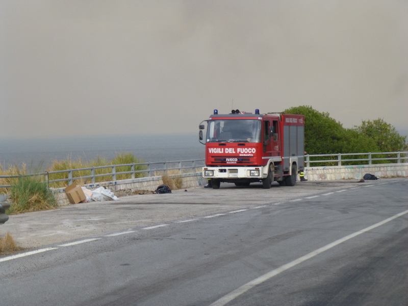 After visiting Catania our plan was to cut across the island to the north coast to stay at a campsite on the beach that a German couple had recommended to us, however we arrived in the midst of a forest fire! As we got close to the area we could see clouds of smoke and closer still you could see olive trees burning. On the road to the site there were a number of fire trucks, plus locals standing around talking anxiously into mobile phones and hosing down the fronts of their gardens and properties presumably in an attempt to prevent the fire taking hold should it get that far. I was all for staying in the campsite on the basis that it was close to the sea and the smoke would keep the mosquitoes away! However I bowed to Sharon’s better judgement and as we drove further up the road and we could see water bombing planes going backwards and forwards I conceded that maybe Sharon was right.