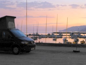 This did present us with a bit of a problem though as we couldn’t find any campsites further up the coast. In the end we spotted someone in a camper van wild camping in a marina on the coast below the road which we were on so we headed on down to find not one but 4 camper vans dotted around a large unpaved area of waste ground. So we pulled up alongside the marina so that we had a good view and spent the night there. Not quite peaceful – dog in distance barking all night, local driver doing doughnuts on waste ground at midnight and cockerels crowing in the children’s farm which we discovered the next morning was just next to us on the beach.